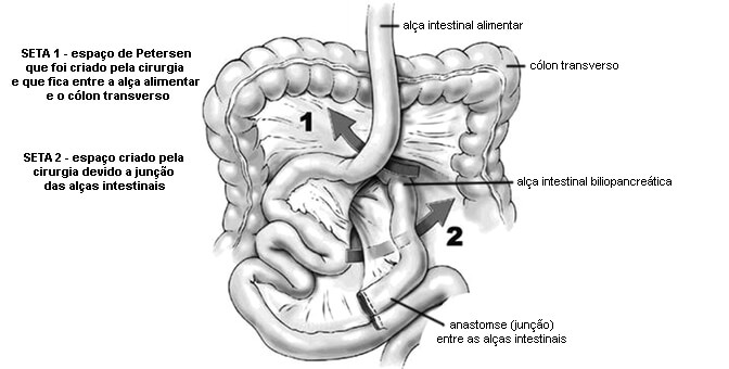 A hérnia pode ocorrer quando o paciente que foi operado perde bastante peso e acaba havendo a migração de um segmento de intestino fino, através dos espaços ou brechas que são criados artificialmente durante a cirurgia.